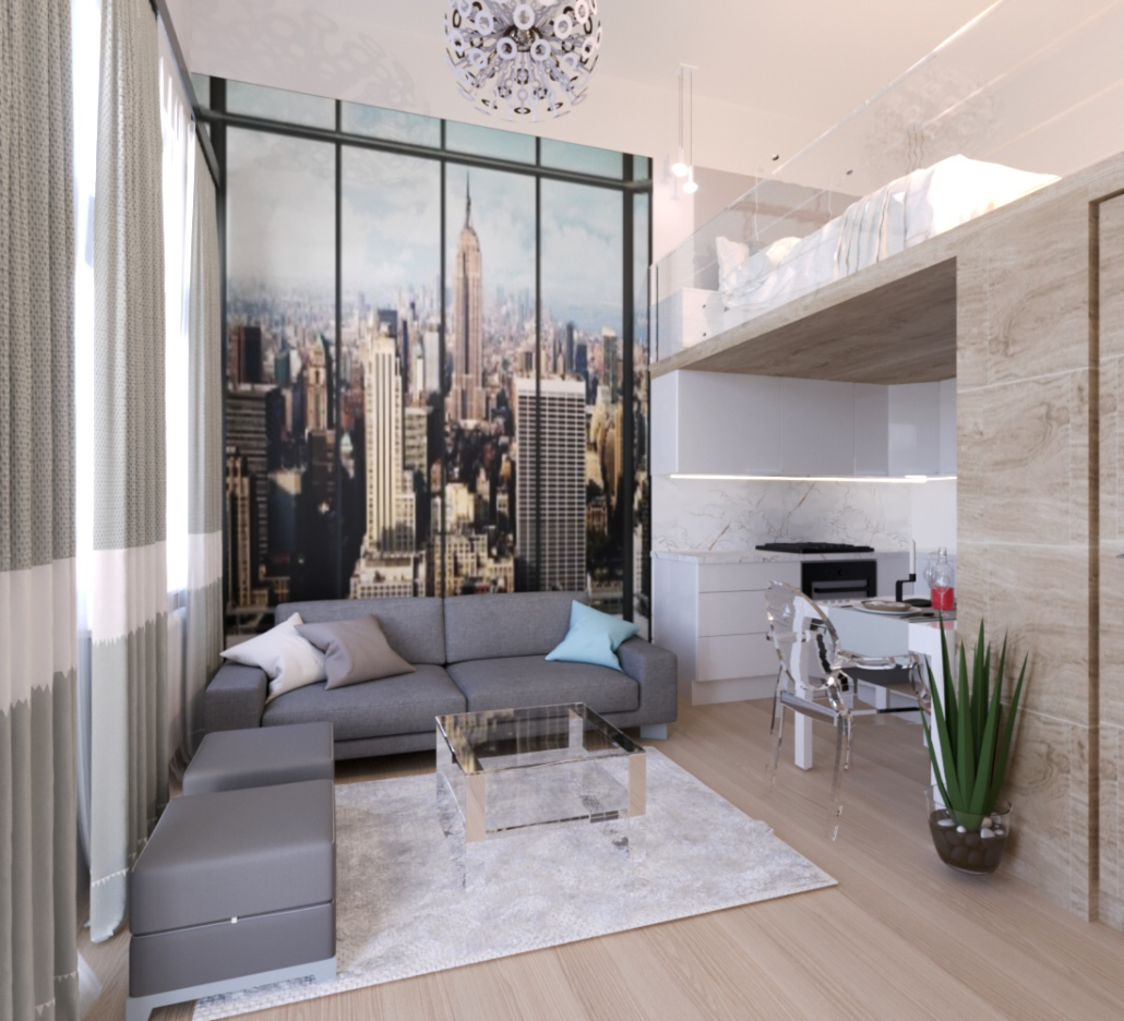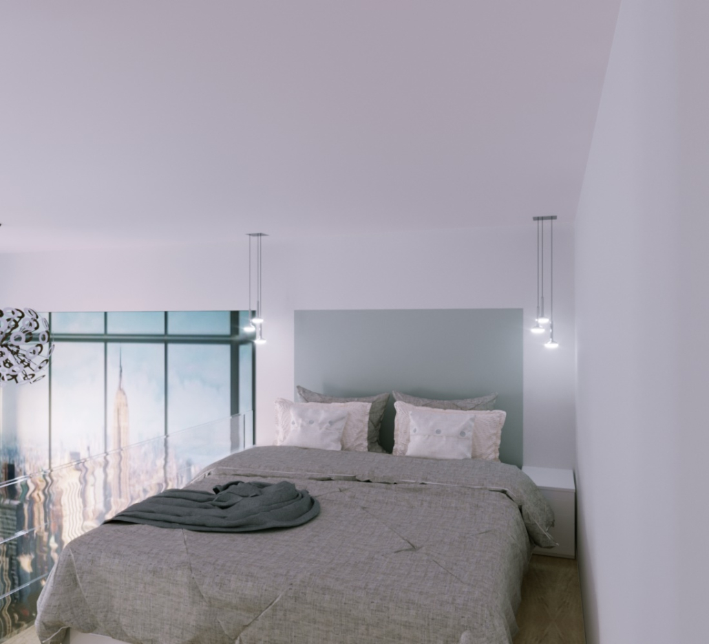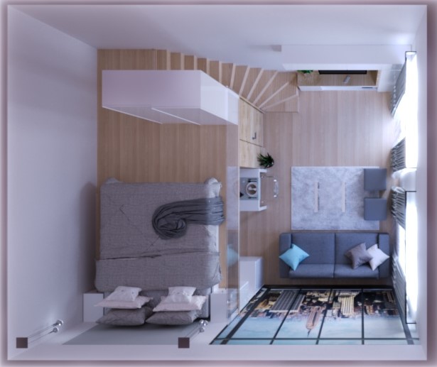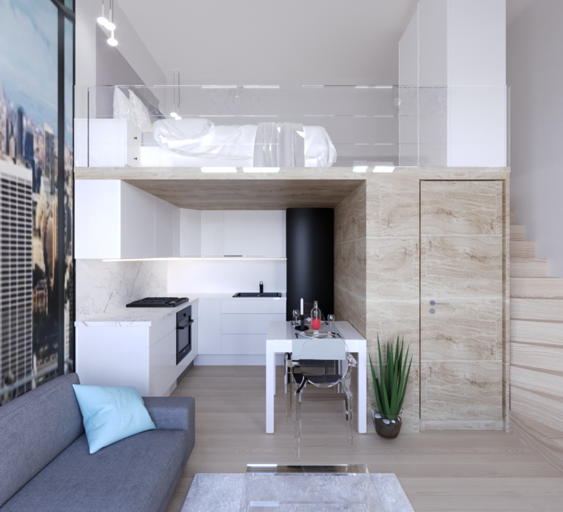 Mindent sikerült elhelyezni, amire szükség lehet, van nappali, szeparált háló rész a galérián, alatta teljesen felszerelt konyha és fürdőszoba.