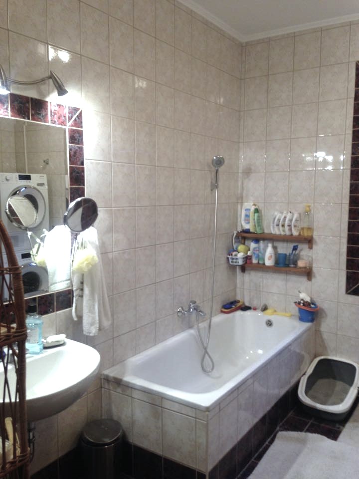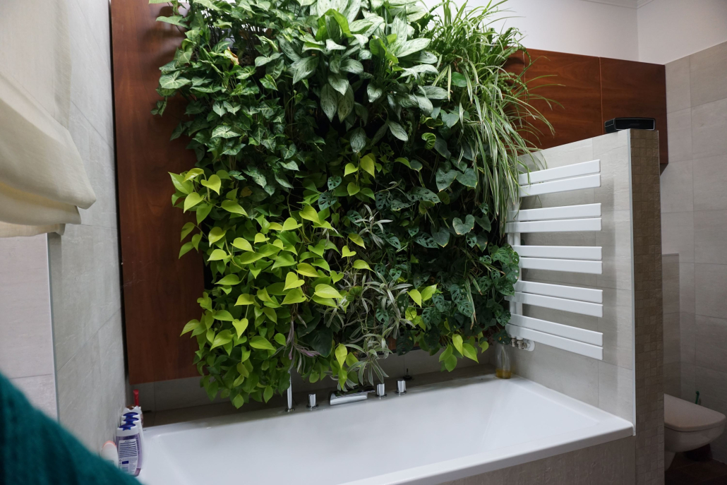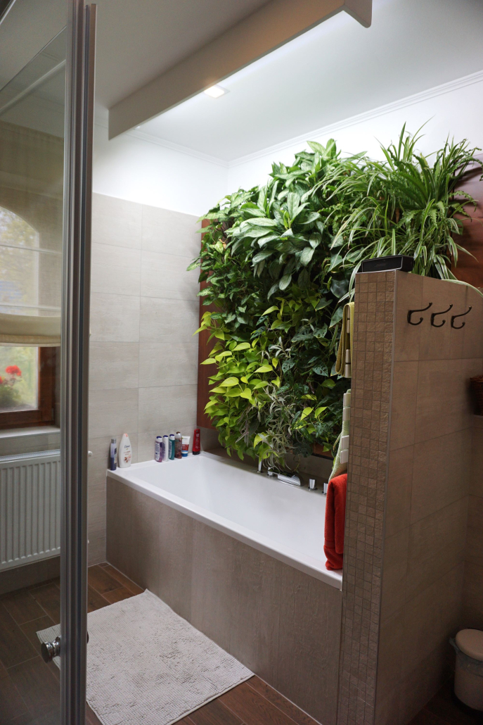 Mészkő hatású burkolat, tölgyfa svédpadló, tömörfa bútorok, növényfal a fürdőben.